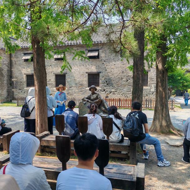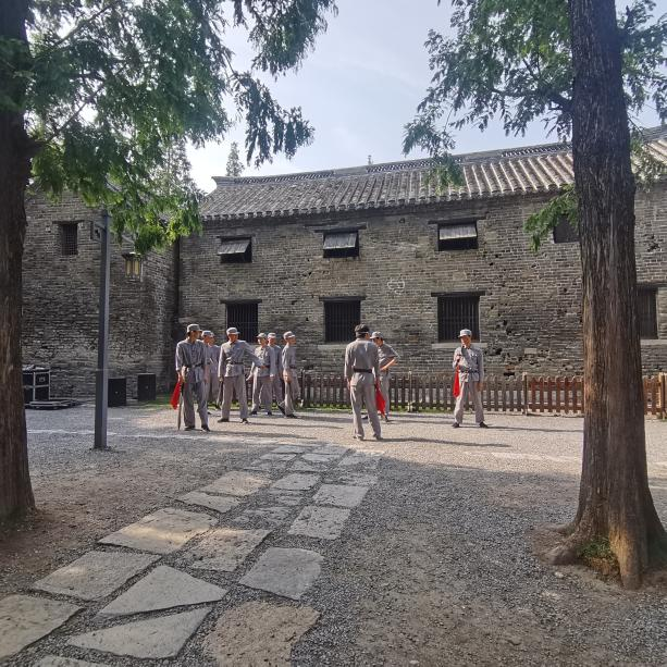 臺兒莊古城不僅是千年運河古城,更是臺兒莊大戰(zhàn)重要遺址地,城內(nèi)留存 53 處“二戰(zhàn)”遺址。在大戰(zhàn)遺址紀念園,昔日的槍炮聲雖已沉寂,但英雄的氣概仍激蕩長空。輕撫著彈痕累累的古城墻磚,指尖仿佛感受到歷史的余溫,這些彈孔不是冰冷的凹陷,是先烈用生命刻下的信仰圖騰。黨員們漫步古城石板路,尋覓戰(zhàn)爭遺跡,聆聽講解員講述戰(zhàn)斗故事,近距離觸摸歷史,體會先輩保家衛(wèi)國的巨大犧牲。